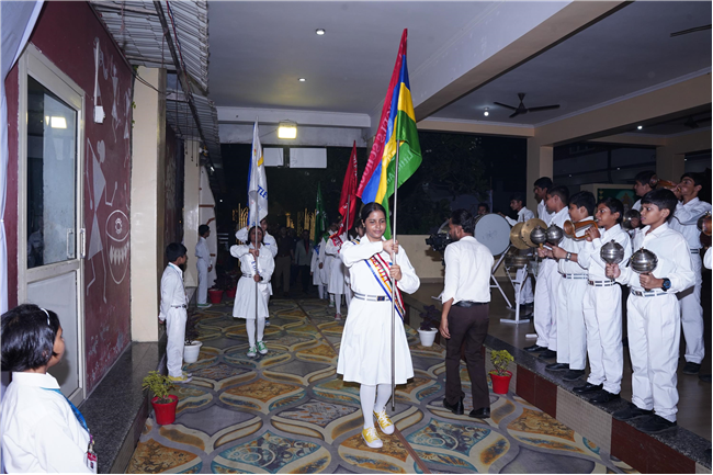 The evening commenced with the ceremonial welcome of the Chief Guest by the school band, followed by the lighting of the lamp invoking the blessings of Goddess Saraswati. The school choir presented a soulful Saraswati Vandana, setting a divine tone for the evening.
